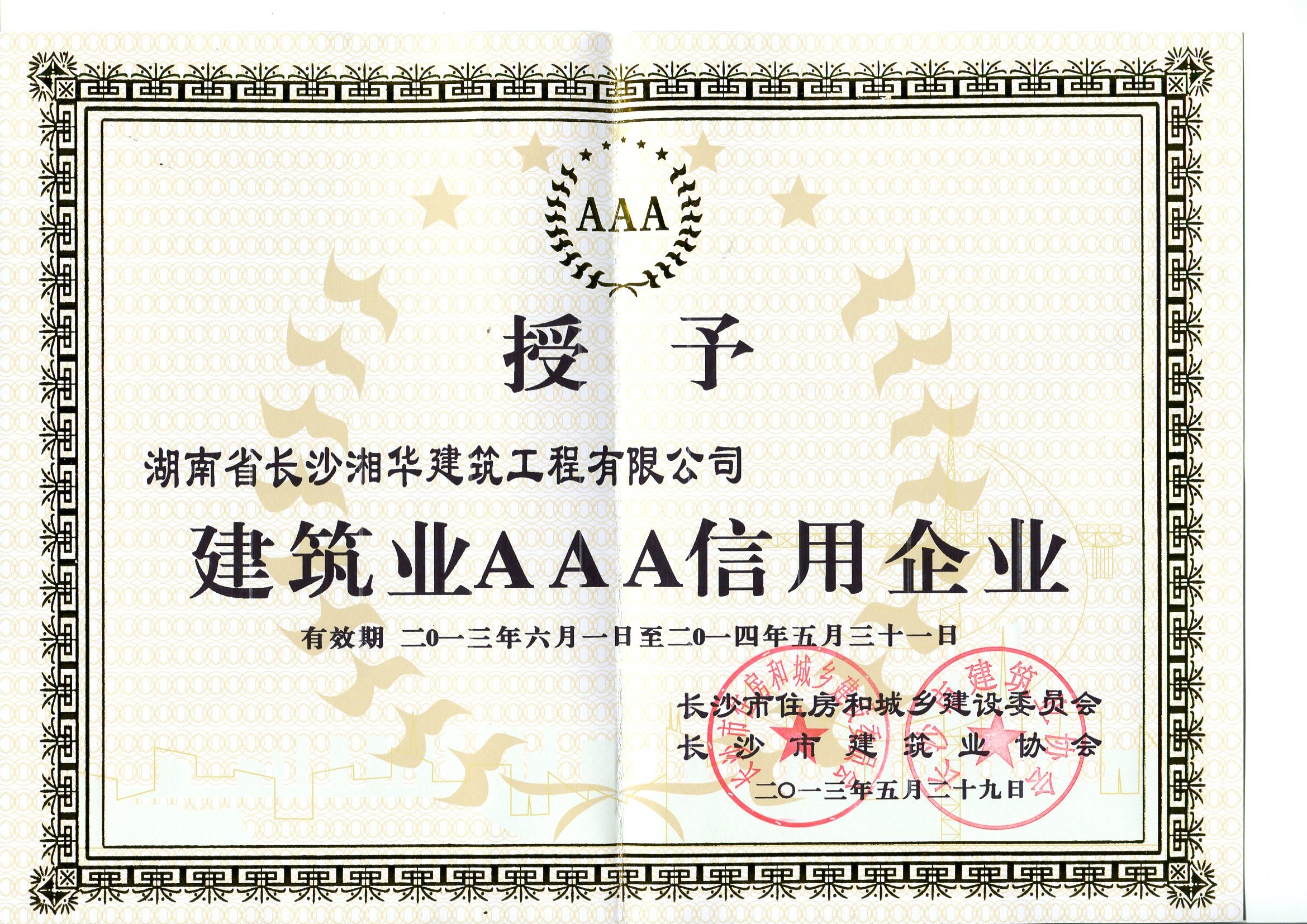 29日長(zhǎng)沙市建筑行業(yè)管理工作會(huì)議暨信用企業(yè)授牌儀式舉行,經(jīng)過(guò)長(zhǎng)達(dá)三個(gè)月的嚴(yán)格考評(píng),2012年度長(zhǎng)沙建筑業(yè)信用企業(yè)終于誕生,我公司再次榮獲“長(zhǎng)沙市建筑業(yè)3A信用企業(yè)”,這是自長(zhǎng)沙市開(kāi)展建筑業(yè)企業(yè)信用等級(jí)申報(bào)評(píng)定工作8年以來(lái),我公司連續(xù)獲得的第八次建筑業(yè)3A信用企業(yè)稱號(hào)。