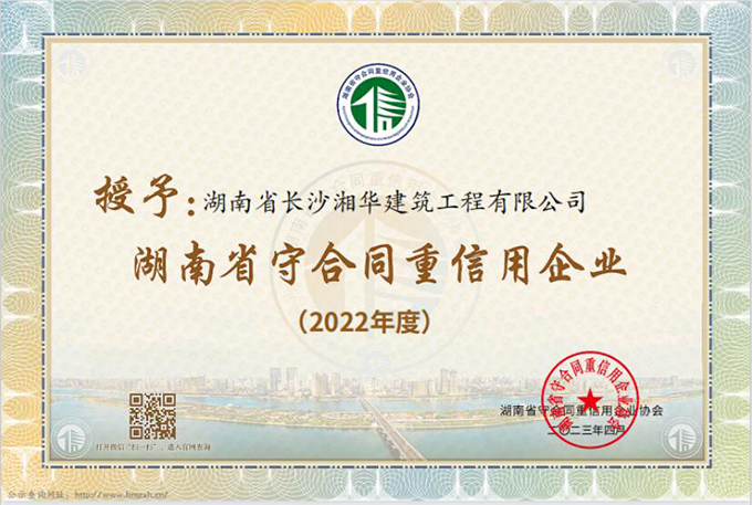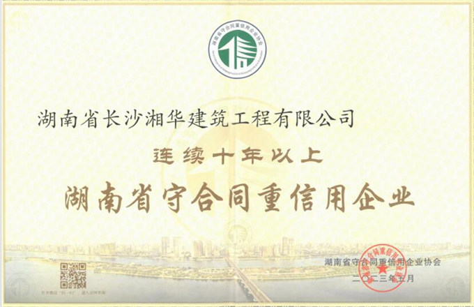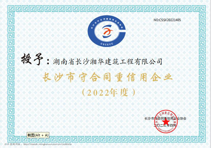 近日,我公司喜獲“連續(xù)十年以上湖南省重合同守信用企業(yè)”榮譽稱號,同時被評為2022年度“湖南省重合同守信用企業(yè)”、“長沙市重合同守信用企業(yè)”。